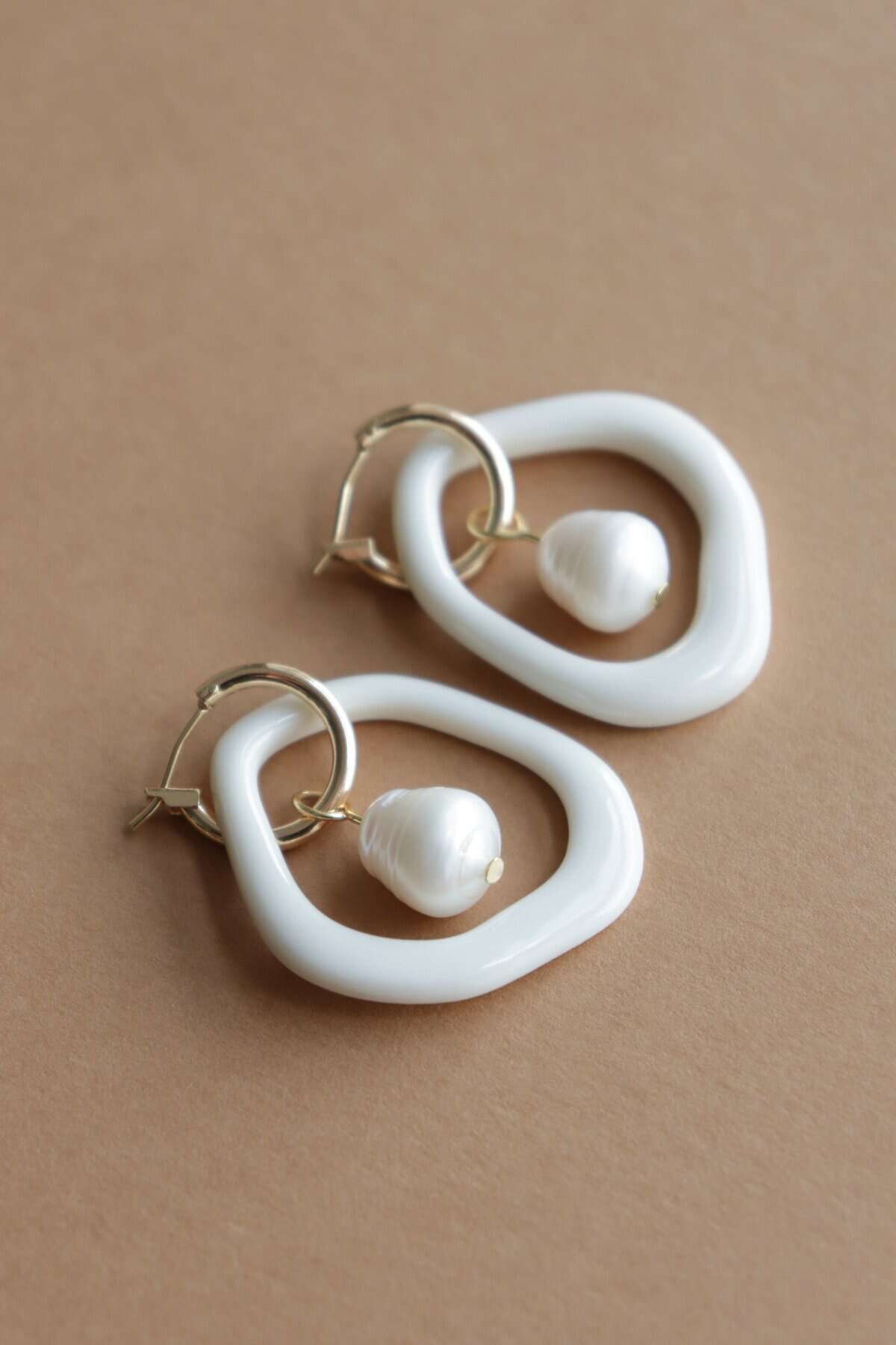 Delikata handskulpterade bitar av porslin och pärla. ”Arp”-örhängen är gjorda av flera element, som kan kombineras på 4 olika sätt.