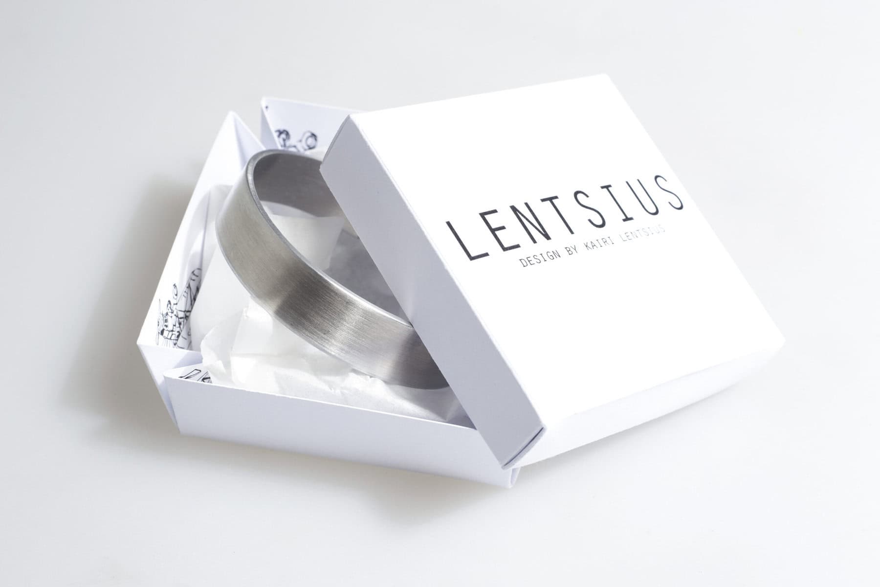 Att kombinera former, ny teknik och okonventionella material ger Lentsius smycken hög visuell stil och individualitet. Varje föremål är designat för att vara hållbart genom att återvinna industriella restmaterial – detta skapar perfekt balans för människor som värdesätter naturen och funktionell skandinavisk stil. Aluminium är ett bekvämt material som inte kräver särskild vård.