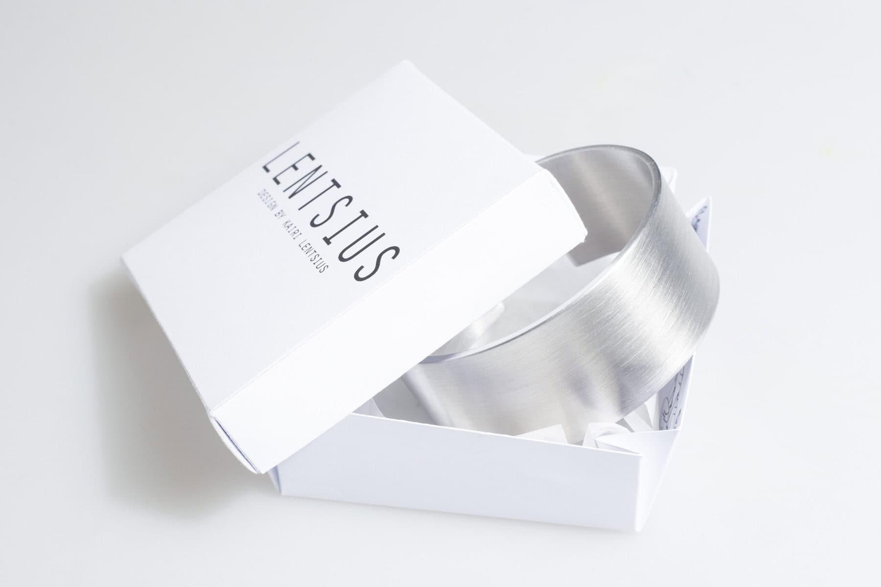 Att kombinera former, ny teknik och okonventionella material ger Lentsius smycken hög visuell stil och individualitet. Varje föremål är designat för att vara hållbart genom att återvinna industriella restmaterial – detta skapar perfekt balans för människor som värdesätter naturen och funktionell skandinavisk stil. Aluminium är ett bekvämt material som inte kräver särskild skötsel.