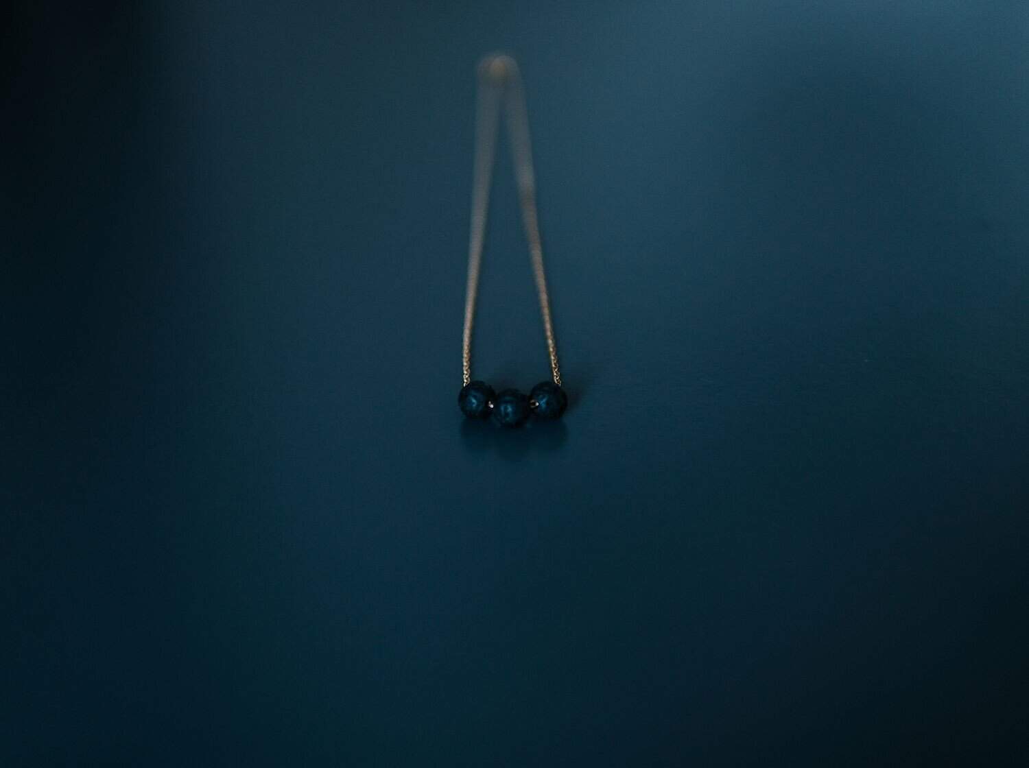 Ett enkelt och naturligt sätt att bära din favoritdoft med dig. Detta handgjorda halsband har tre äkta lavapärlor på en 45 cm lång kedja i rostfritt stål, tillgänglig i guld- eller silverfärg.