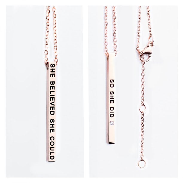 Olla-halsbandshänget säger ”She Believed She Could” på ena sidan och ”So She Did” på andra sidan.